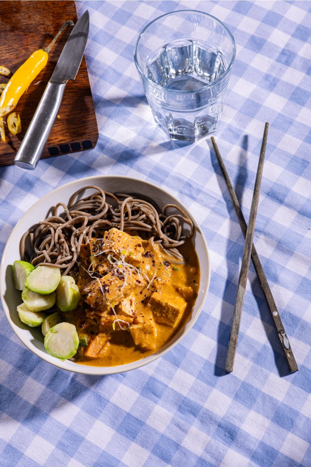 Tofu s batáty a cuketou v kokosovém mléce s mandlovým máslem, tamarindem a kapkou sojové omáčky.